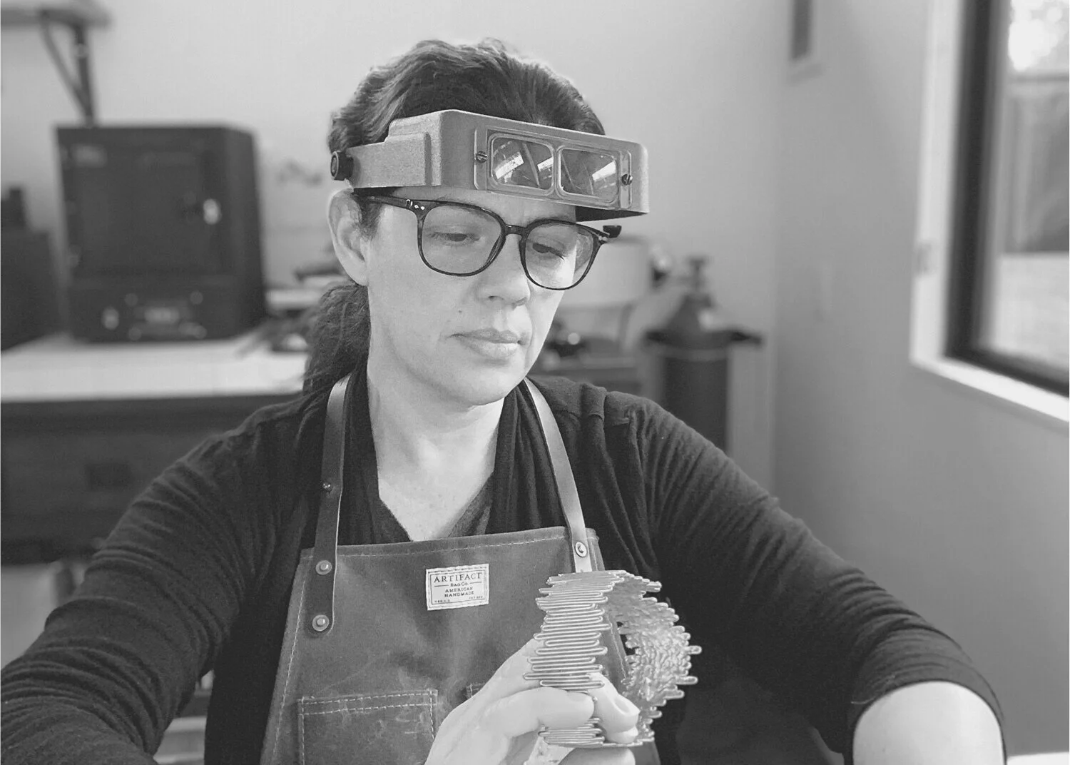 In addition to metals, in her work one can see the tendency to explore different materials such as glass, ceramics, concrete, polymer, textiles and others to create extremely tactile pieces.